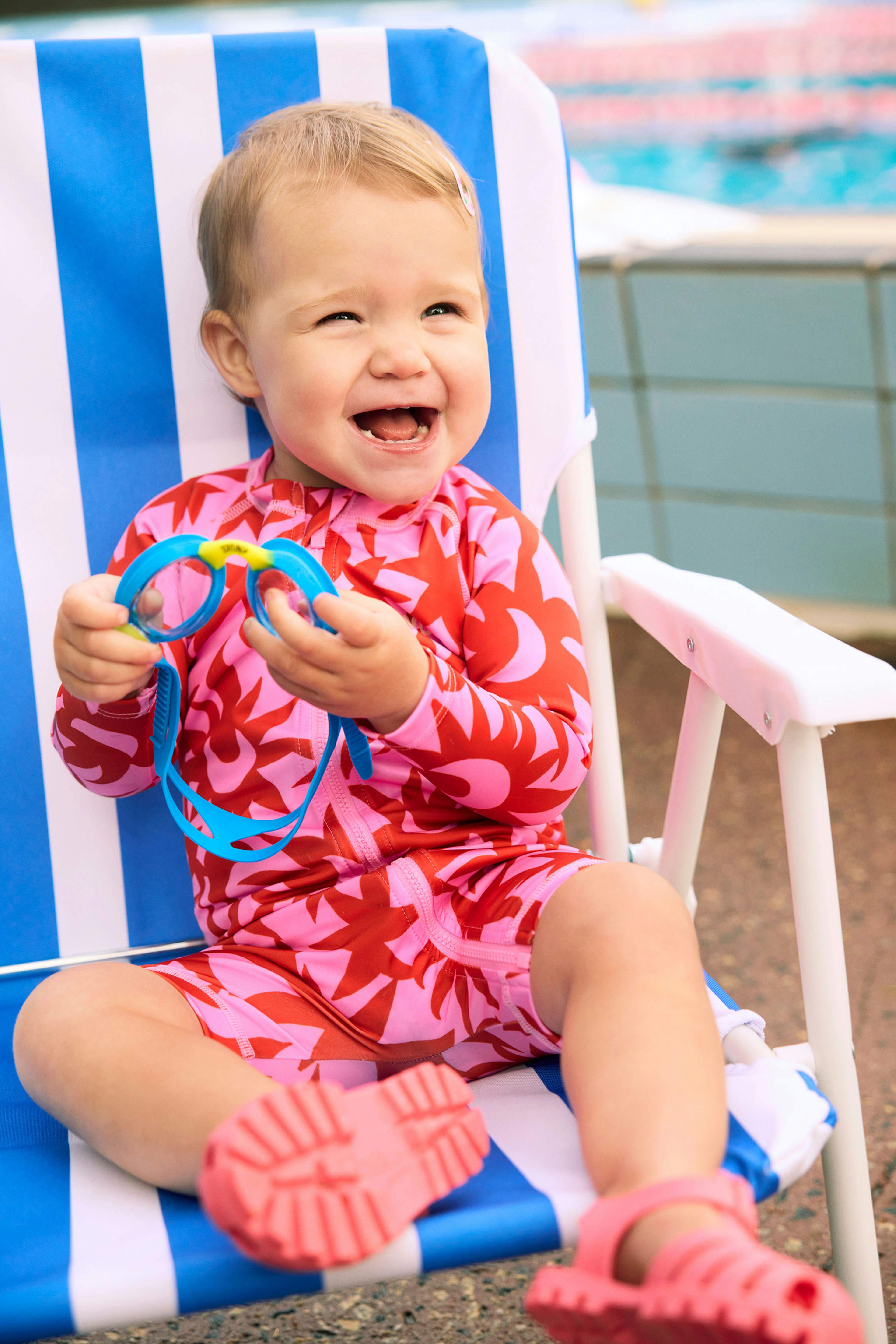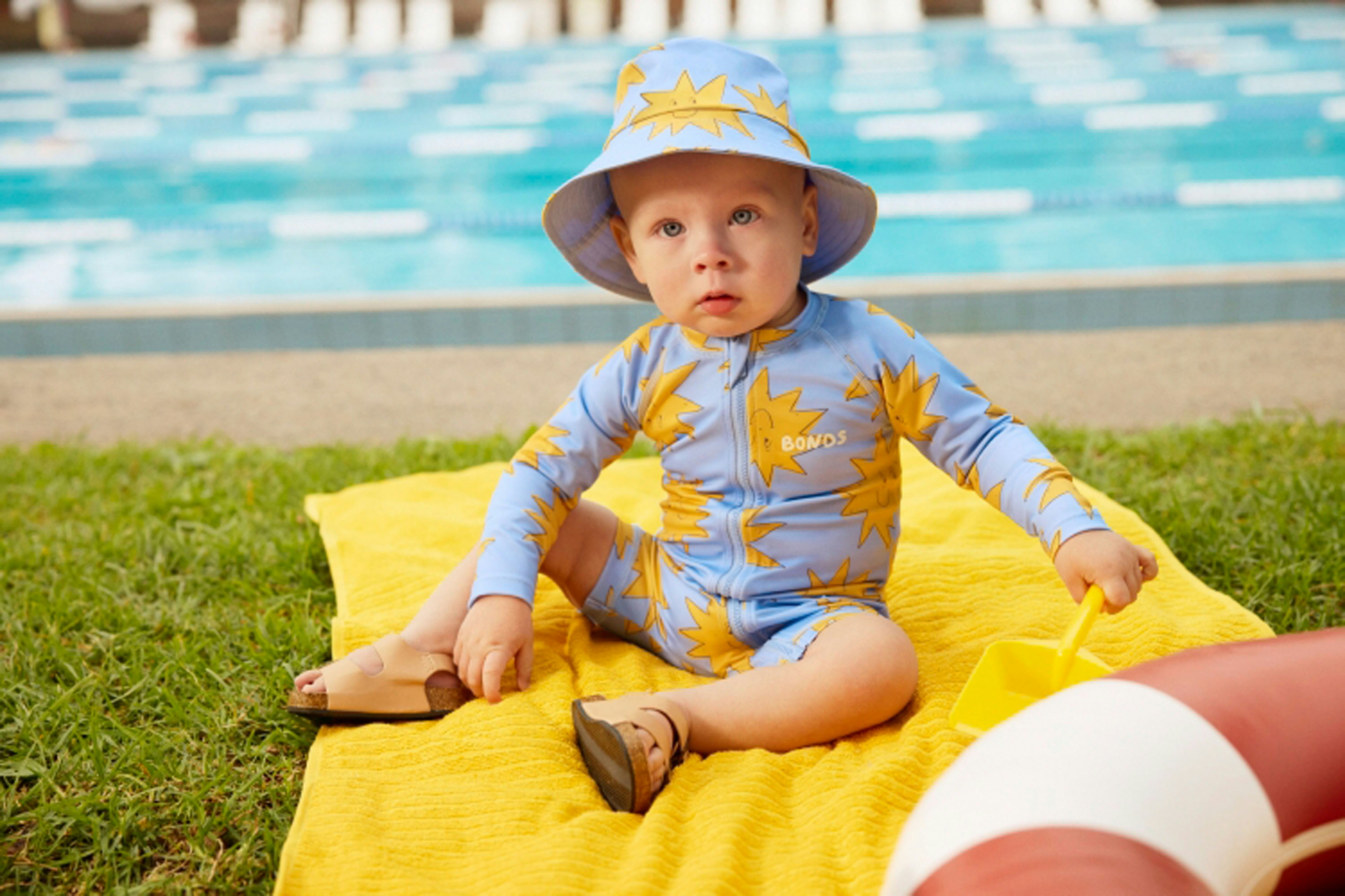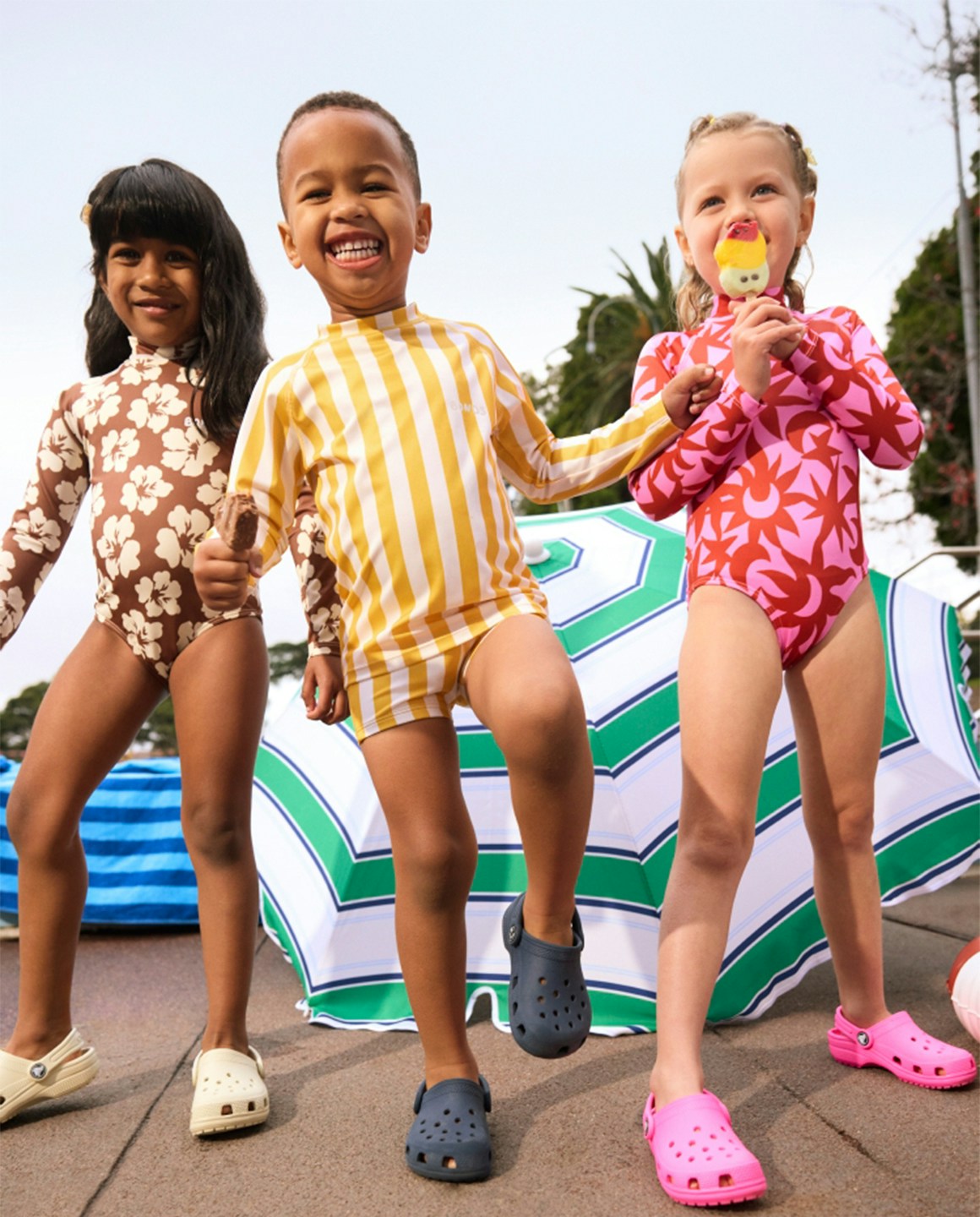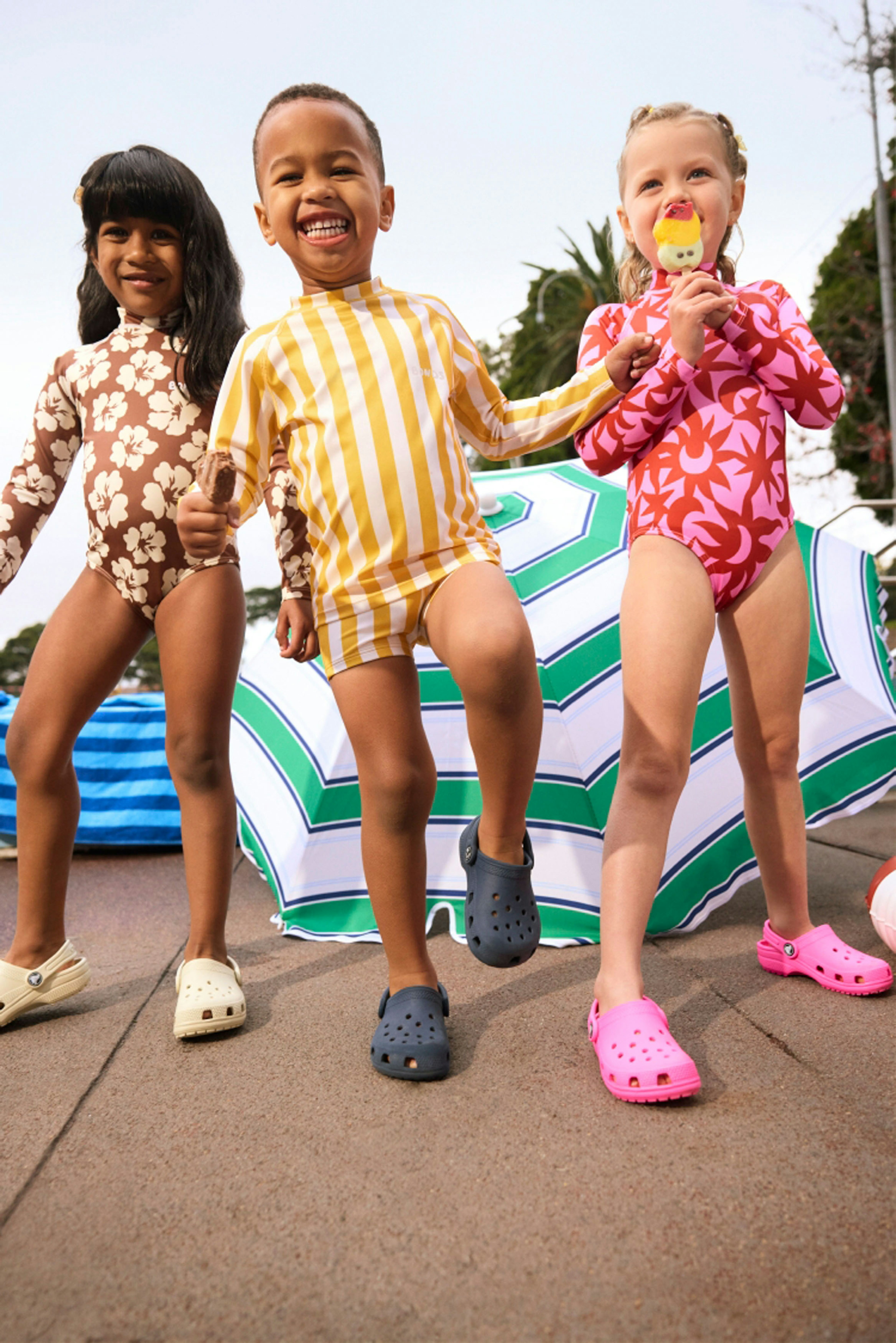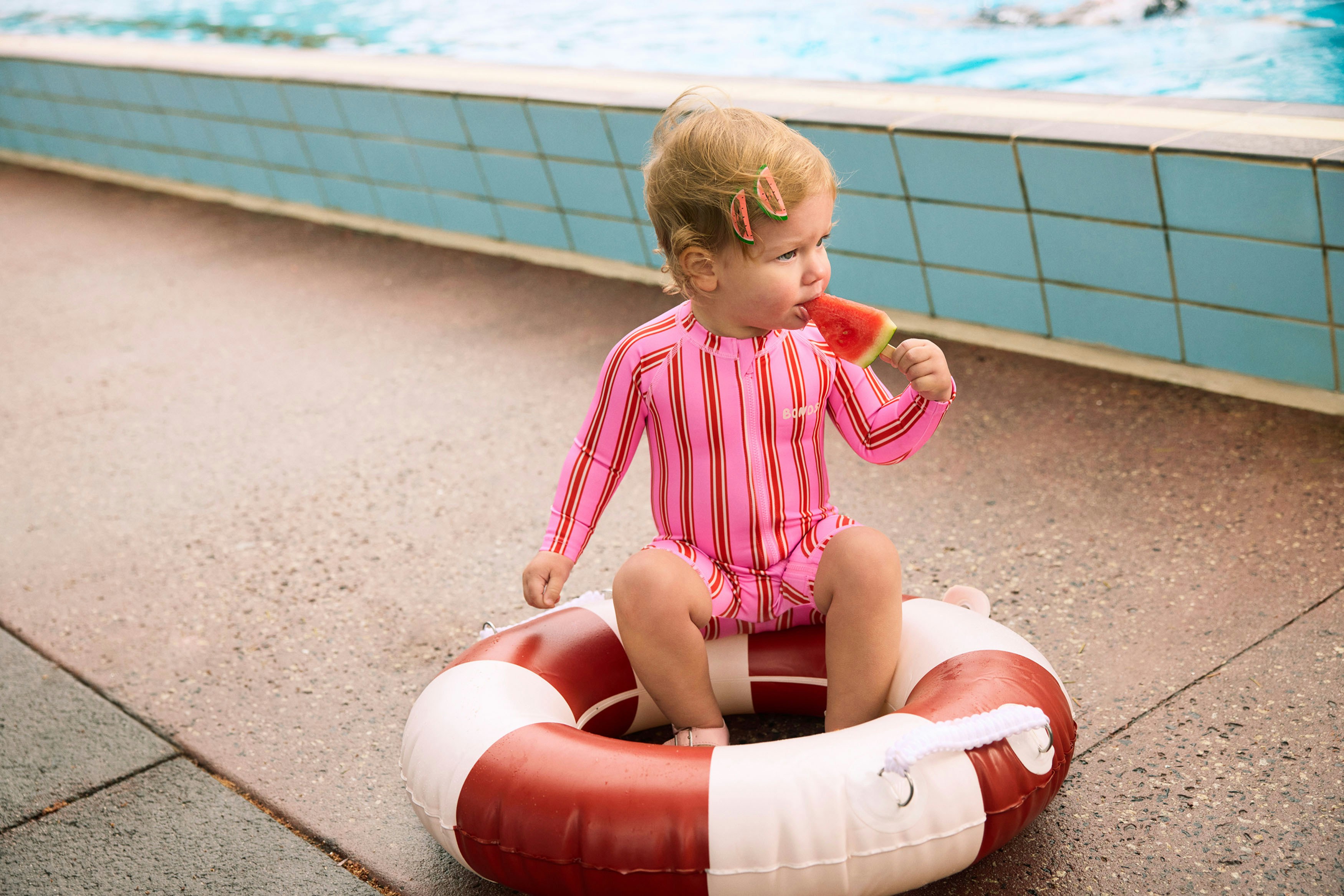 The first campaign revolved around a new kids swimwear collection, so we based our concept on nostalgic summer days at an outdoor pool. We leaned into the vibrant colours and prints of the range through wardrobe and set styling, incorporating playful props like inflatable pool toys, beach chairs and icy poles.