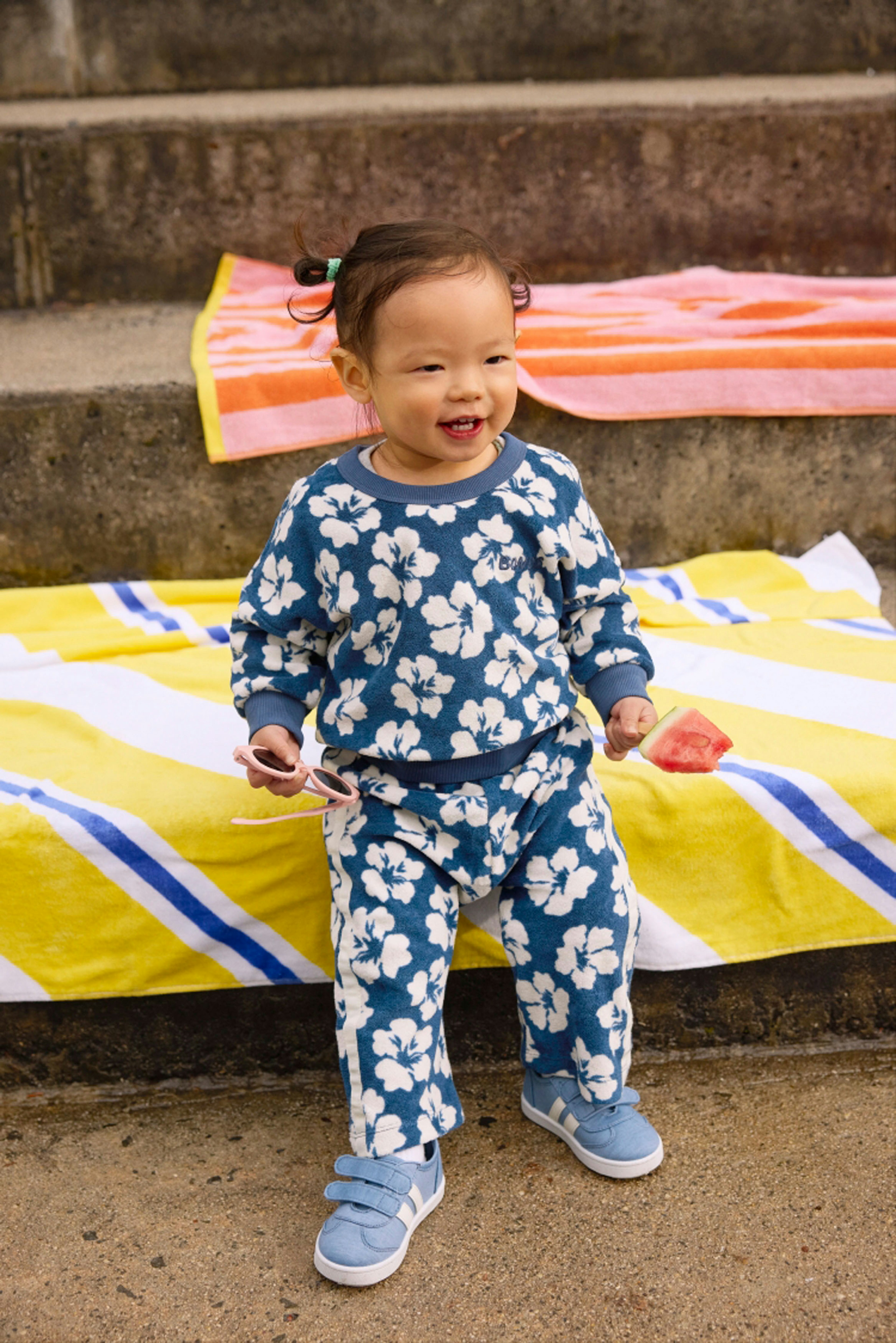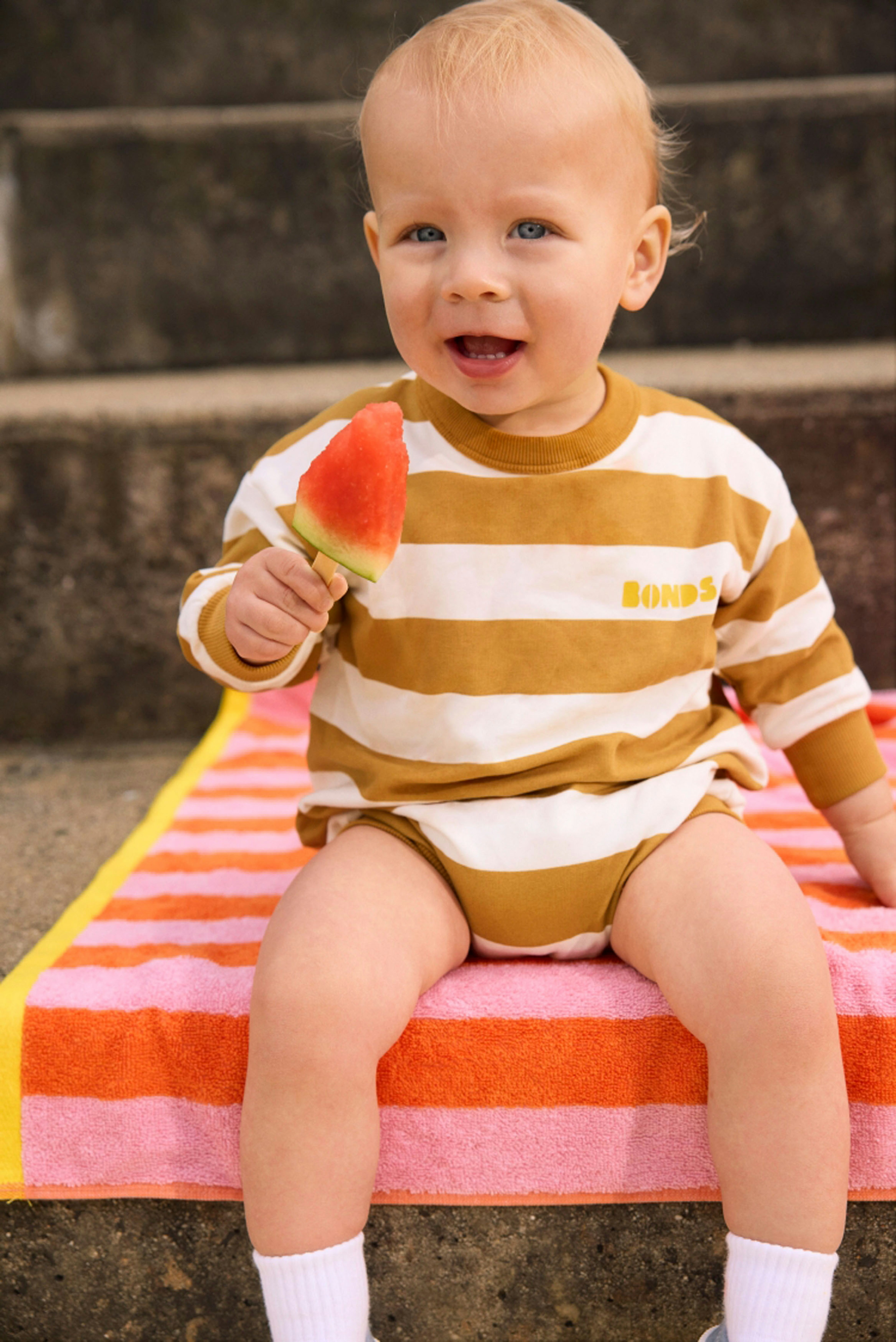 For the second campaign, the aim was to show off Bonds’ new terry towelling kids clothing range. For these shots, we utilised less obviously pool-related spots on location and used set and wardrobe styling to differentiate the two visual storylines.